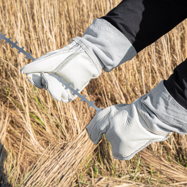 Für das Befestigen des Stacheldrahtes empfehlen wir ihnen Handschuhe zu tragen.